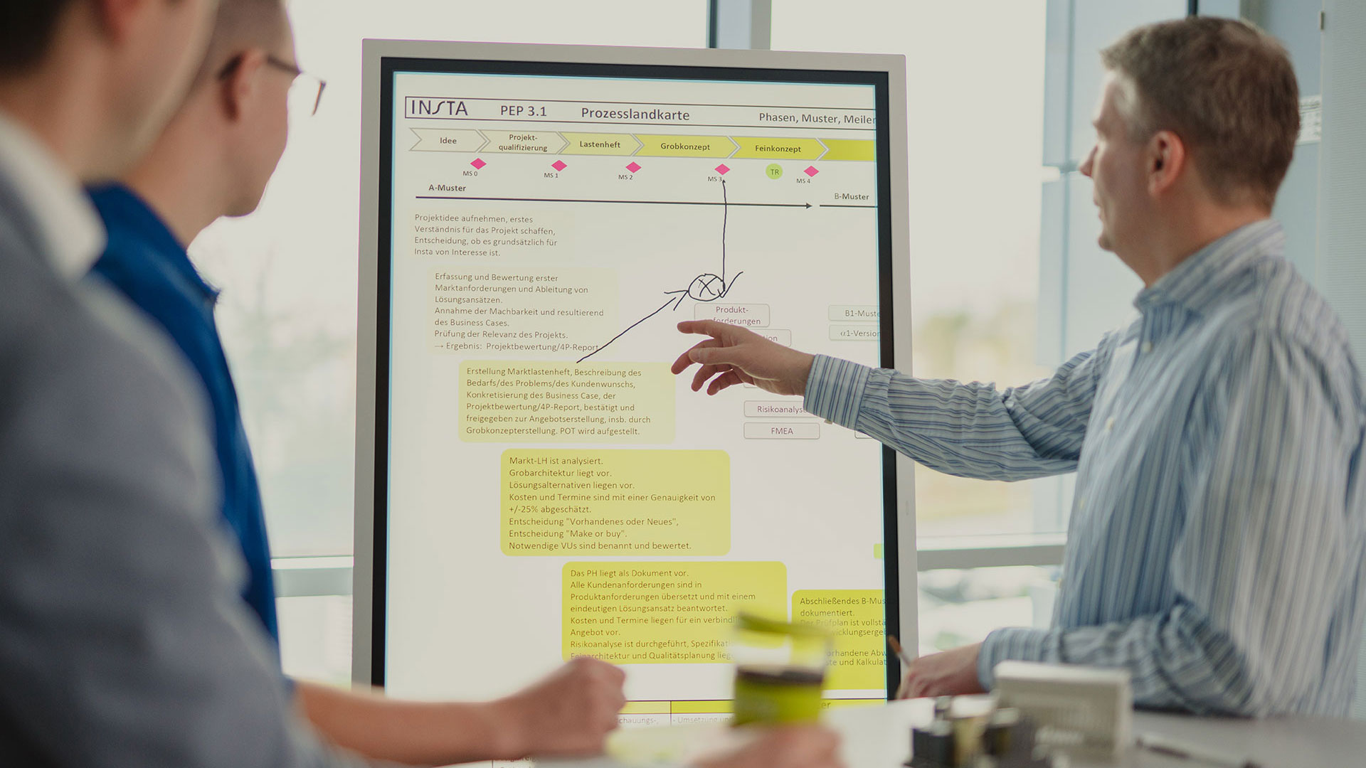 At Insta, we follow our own Product Development Process (PDP), which combines a classical PDP approach with an additional development process. In the Insta PEP that we have designed, we utilise traditional milestones to track project progress, while also incorporating an alternative approach. Within this process, we have the flexibility to work with agile, iterative methods or hybrid approaches, following the V-model if required.